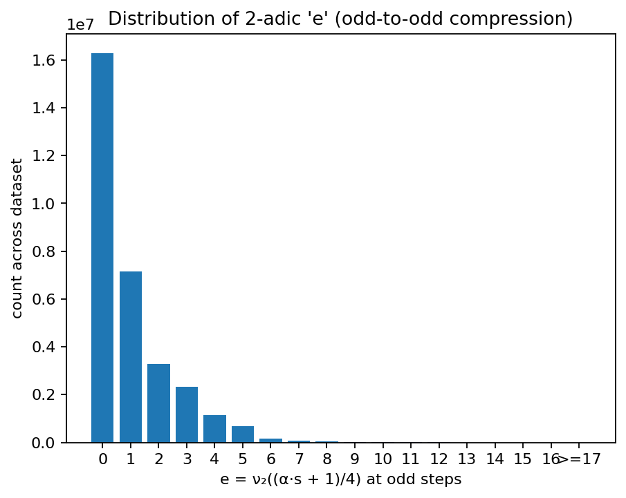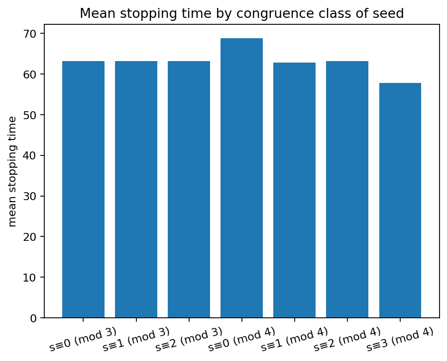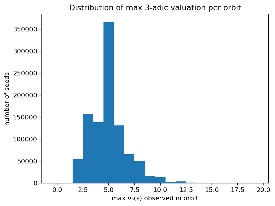Much more contractive than Collatz, so stopping time grows slowly. Interesting imbalance in 0mod4.