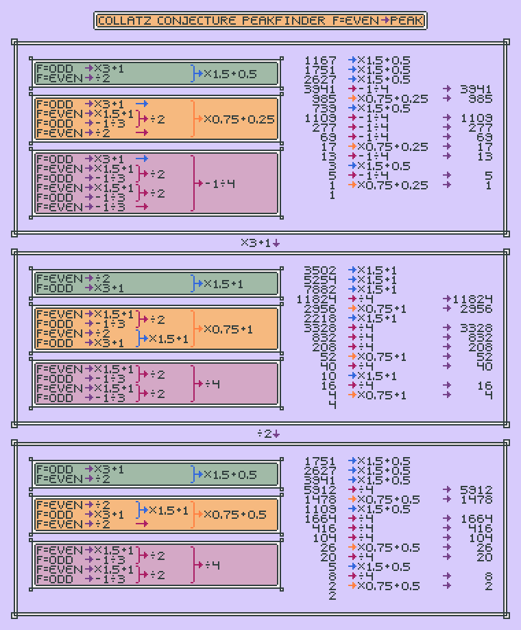 Feeling tired of dealing with all those uneven and even numbers at the same time? Bored with the 3n+1 / 2 routine? Or simply only want the peak numbers of your number? Well try this!