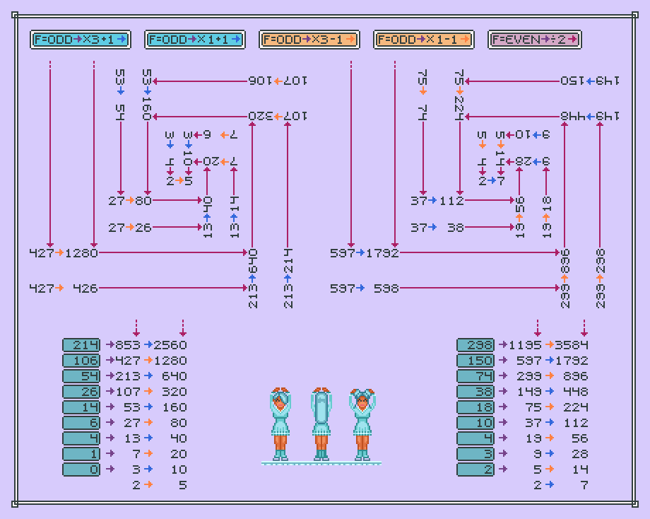 where a,b are odd integers (except that, maybe for simplicity, you omitted the “short-cut” division by 2 for odd integers in T, with a few other discrepancies in the upper parts that are still unclear to me). The above functions indeed verify