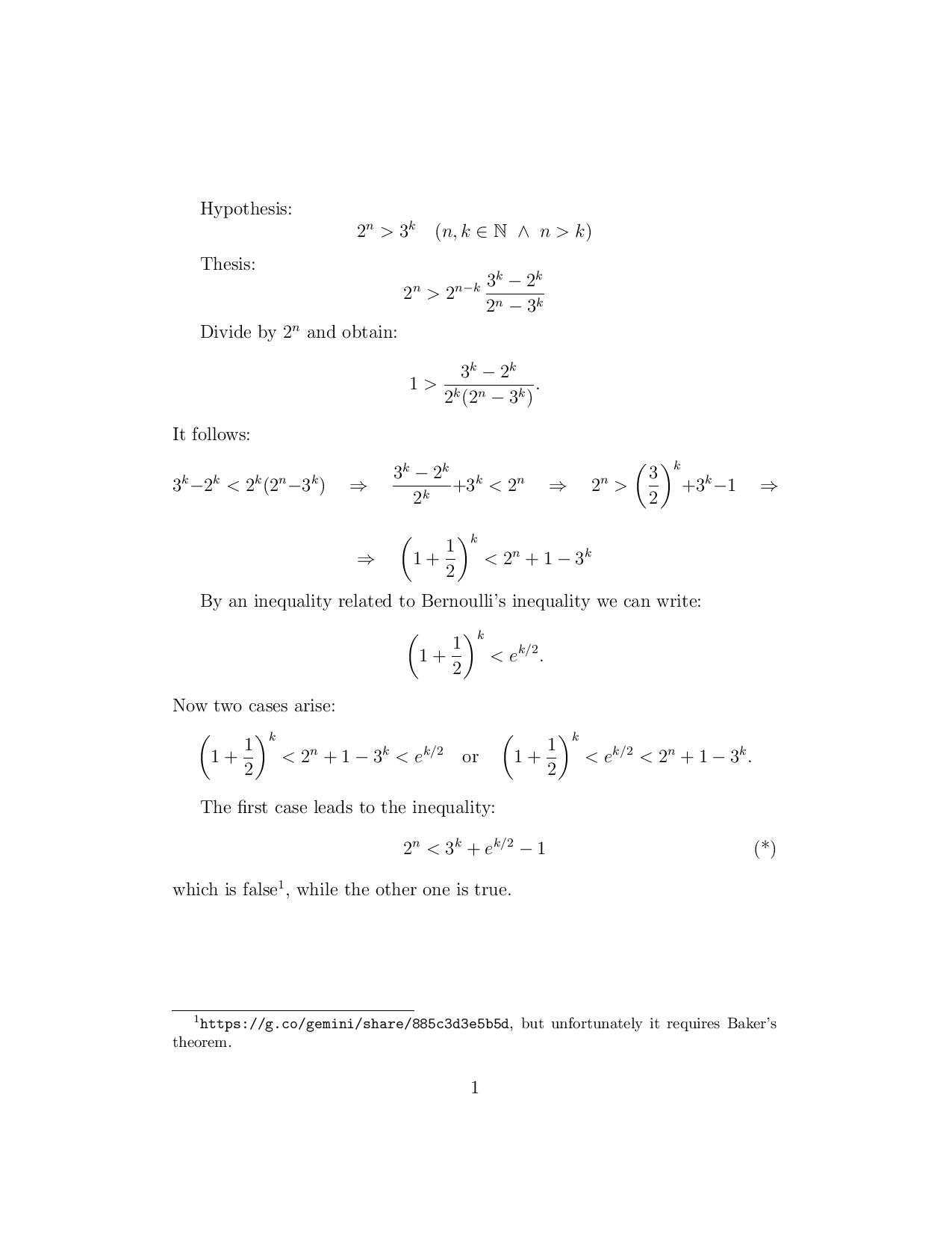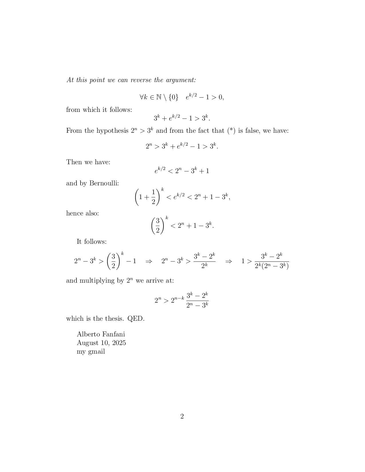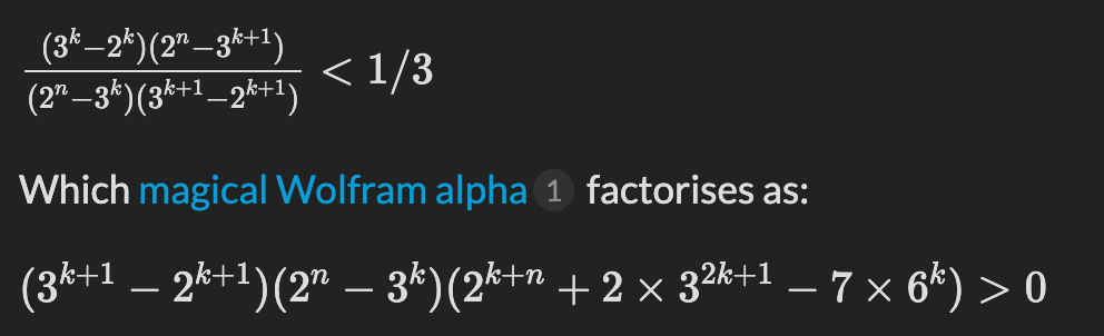 # 2^(n-k) + 3^k < 2^n; n >= 3; k >= 1; 2^n > 3^k