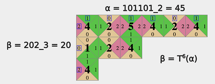 Which corresponds to the Collatz sequence 20 = T^6(45) where 45 is encoded in base-2 on the top of the assembly and 20 in base-3 on the left of the assembly: