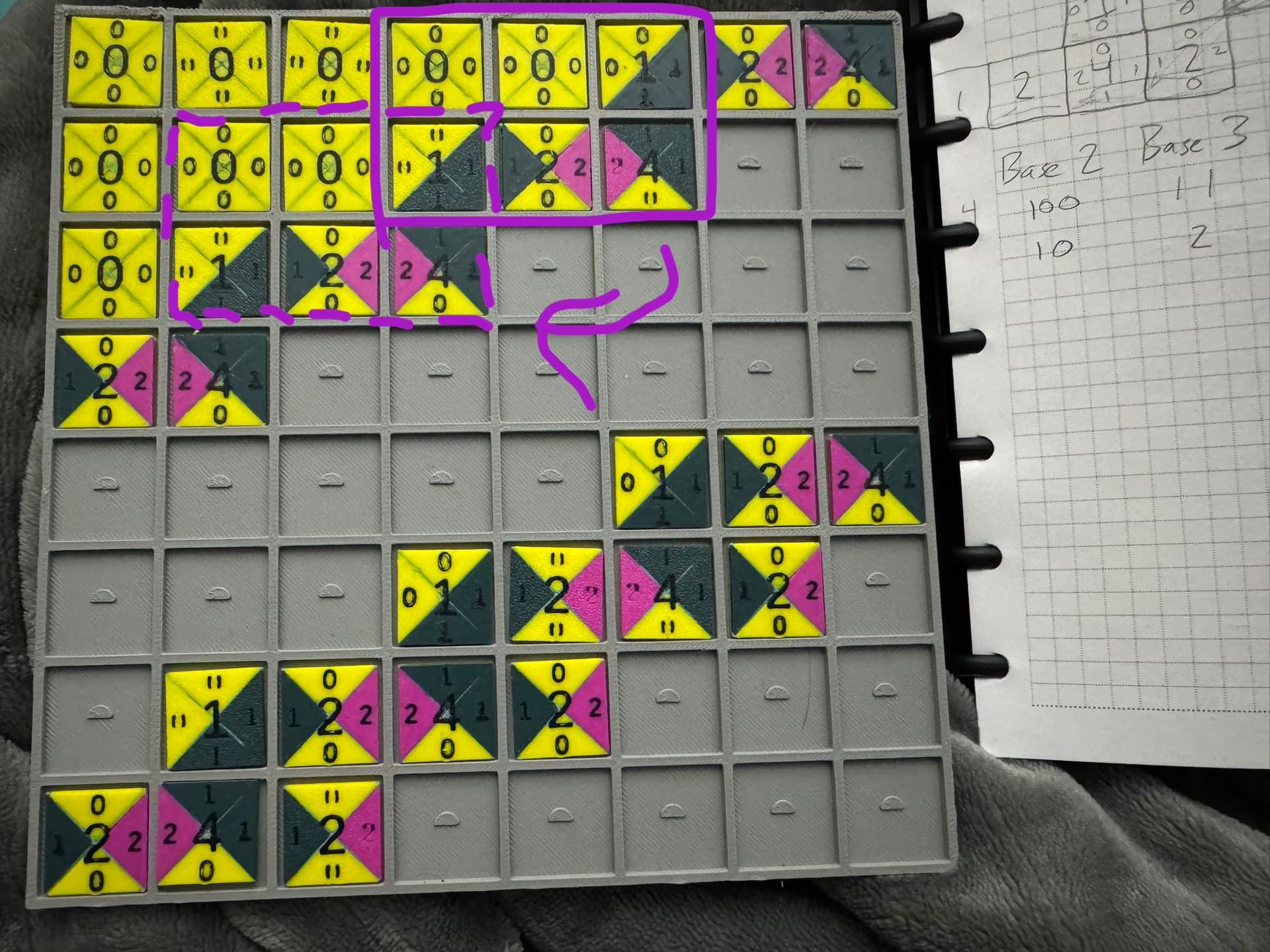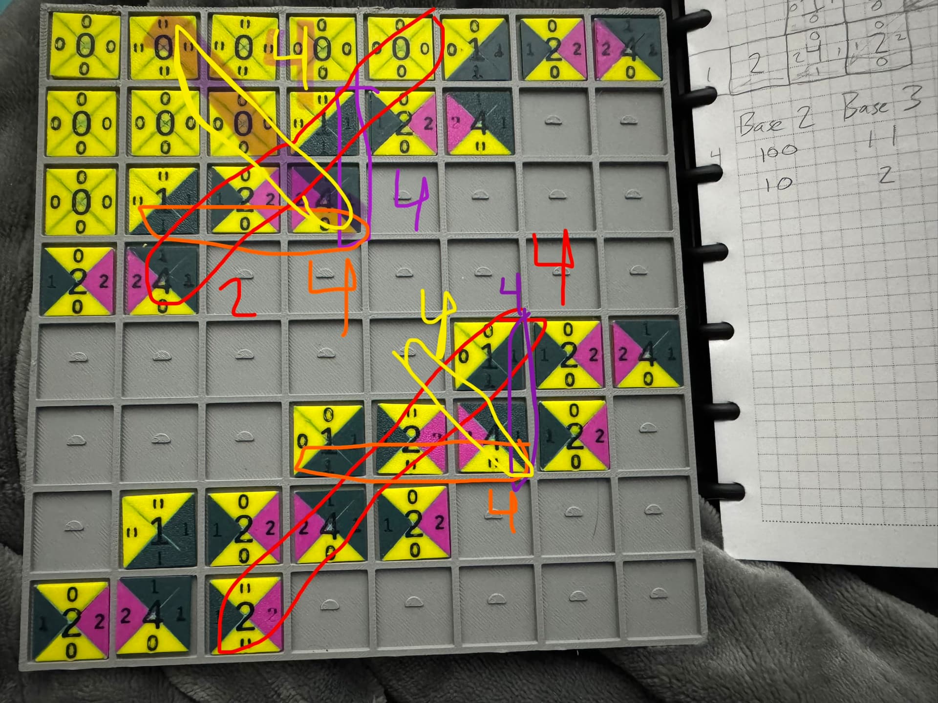 . The above focused on base 2 and 3 but these tilings also feature base 6 (top-left-going diagonal), base 3/2 (top-right-going diagonal), and more generally any base of the form 2^a3^b > 1 with a,b\in\mathbb{Z} by considering âmacro-tilesâ.
