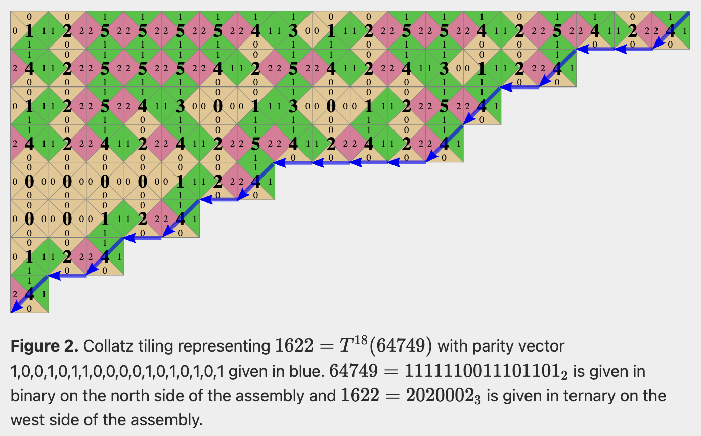 I particularly like the tiles for thinking about Collatz cycles because the question reformulates into a algorithmico-geometric question: âWhy on earth, only the trivial parity vector results in an assembly with the same number in base-2 on top and in base-3 to the leftâ: